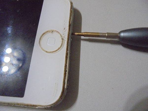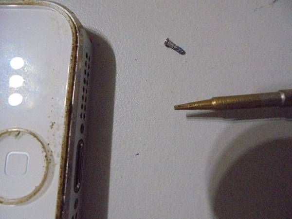 【判定問題】Apple蘋果iPhone 5~32GB智慧型手機的Home鍵無法觸控→發現是電池膨脹頂開觸控螢幕~再導致手機左側邊框被電池撐開縫隙→要更換Li-ion解決全數異常狀況~鬆開並拉出左側螺絲→新北市中和區-張先生【以iPhone專用五星螺絲起子】