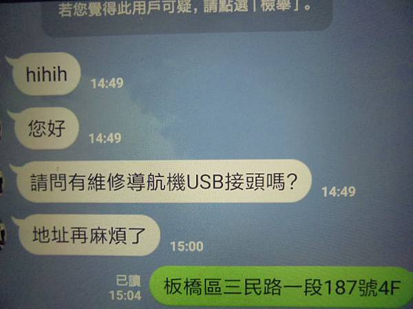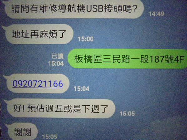 GARMIN台灣國際航電nuvi 57→GPS車用衛星導航莫名無法開機~送板橋府中店檢測→判定Mini USB接座損壞導致不過電~報價後仍不想讓原廠維修→要修好接座繼續使用~我以LINE以文字寫明送修地址→新北市新莊區-郭先生【回覆要等周五或下周送修】