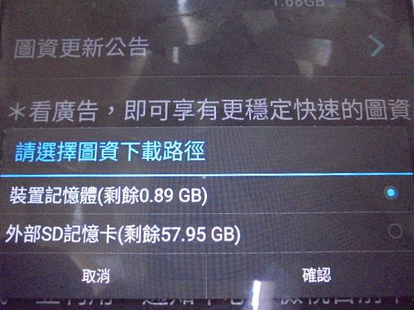 【更新圖資】ASUS華碩ZenPad→Z380KL平板電腦16GB~平板內建記憶體為最小容量→內建儲存空間近滿無法更新導航軟體圖資~已加裝Micro SD記憶卡64GB擴充空間→請選擇圖資下載路徑~臺北市萬華區-劉小姐【螢幕上勾選外部SD記憶卡剩餘57.95GB】