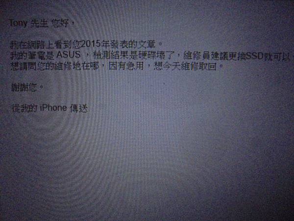 【親送檢測】ASUS華碩S400C→VivoBook筆記型電腦~已經多年未曾使用→國外居住幾年後近期返國~電腦開機使用異常送ASUS判定硬碟損壞→要改為SSD固態硬碟繼續使用~網路搜尋看到我痞客邦發表的文章→臺北市中正區-白小姐【以Yahoo電郵詢問】