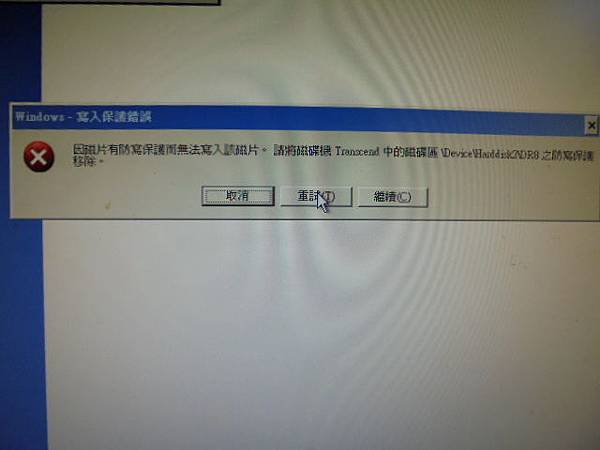 Transcend創見500~8GB隨身碟插上電腦讀取→看得到隨身碟裏的檔案資料~但點選檔案時會閃退還會導致電腦當機→無法複製取出檔案~要救回重要的相片與文件檔案→請將磁碟機Transcend中的磁碟區防寫保護移除~新北市土城區-丁先生【點選重試】
