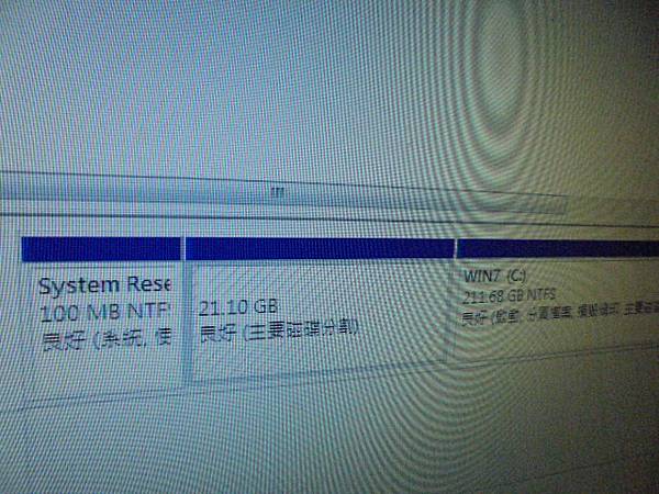 ASUS華碩CM6431桌上型電腦→原廠搭載Windows 7作業系統~已自行還原系統後安裝Office 2010→不知原因卻無法安裝~當天晚上的工作需要使用Office辦公室軟體→磁碟0基本232.89GB~新北市淡水區-李小姐【21.1GB系統還原磁區WIN 7良好211.68GB】 ASUS華碩CM6431桌上型電腦~不久前還原ASUS原廠搭載的Windows 7作業系統→自行安裝Office 2010~卻無法成功安裝→改為SSD硬碟重新安裝Windows與Office軟體~滑鼠點選存放裝置磁碟管理→新北市淡水區-李小姐【250GB硬碟分割為三個使用磁區】
