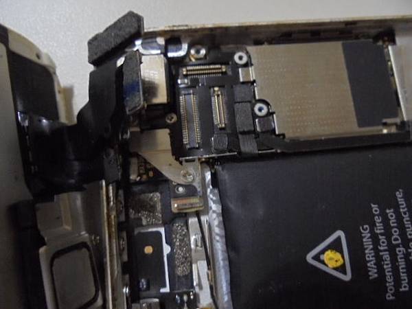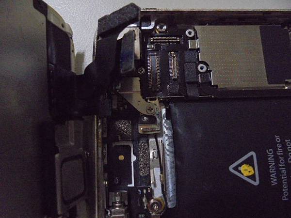 【現場更換】Apple蘋果iPhone 5~32GB智慧型手機的Home鍵無法觸控→發現是電池膨脹頂開觸控螢幕~再導致手機左側邊框被電池撐開縫隙→要更換Li-ion解決全數異常狀況~依序拔除液晶觸控螢幕連接主機板→新北市中和區-張先生【全數的排線】