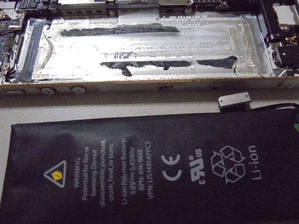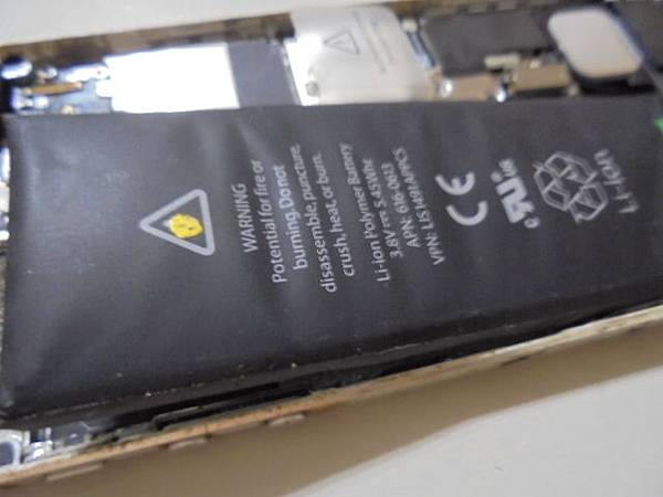 【現場更換】Apple蘋果iPhone 5~32GB智慧型手機的Home鍵無法觸控→發現是電池膨脹頂開觸控螢幕~再導致手機左側邊框被電池撐開縫隙→要更換Li-ion解決全數異常狀況~更換電池完工的手機→新北市中和區-張先生【與膨脹鼓起拆出的原廠電池】