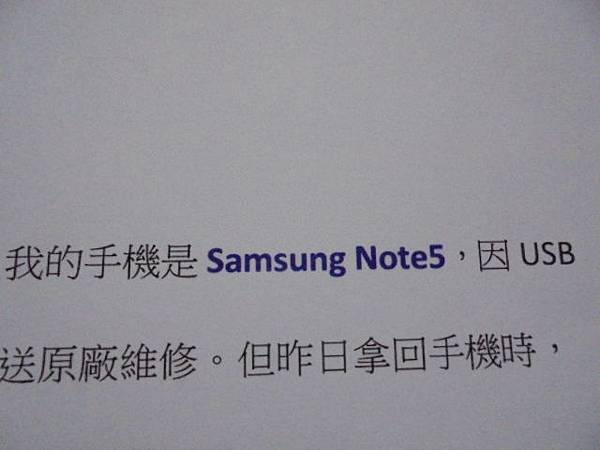 SAMSUNG三星Note 5→GALAXY智慧型手機32GB的Micro USB接座損壞~送SAMSUNG原廠更換新品卻被恢復原廠設定→手機裏檔案資料全數消失不見~想救出簡訊與通話錄音檔→割開紙箱先發現A4紙張~嘉義縣東石鄉-鄭小姐【客戶寫明問題並以彩色列印】