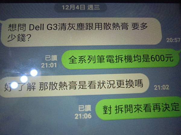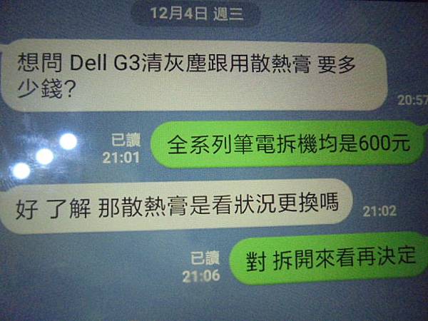 DELL戴爾G3 15遊戲專用筆記型電腦→筆記型電腦開機使用時覺得風扇轉動變得大聲~要清理CPU風扇與加散熱膏→改善現階段的異常狀況~因為曾經是我服務過的客戶→以LINE說明要清風扇與加散熱膏的費用~新北市板橋區-林小姐【寫明拆機的費用】
