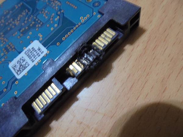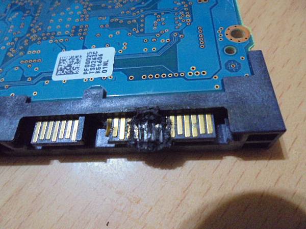 【嚴重燒毀】TOSHIBA東芝3.5吋~1TB硬碟為品牌電腦出廠所搭載→不明原因短路後燒毀SATA電源接座15Pin~電源接口焦黑完全無法使用→曾經找過我更換SATA接座~將硬碟電路板翻回背面→臺東縣臺東市-陳先生【再目視焦黑燒熔的15Pin接座針腳】