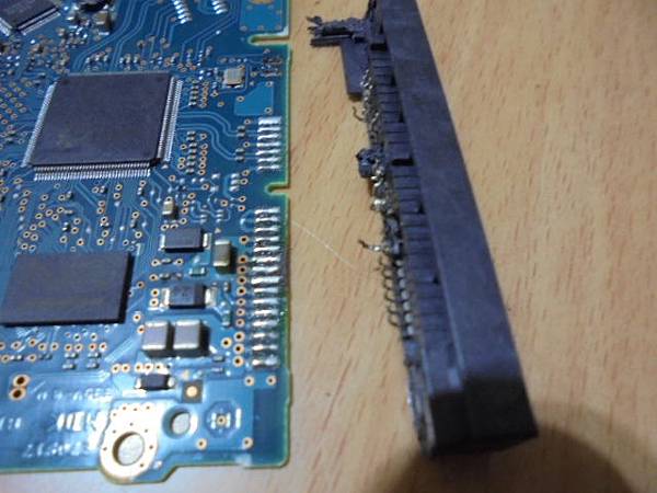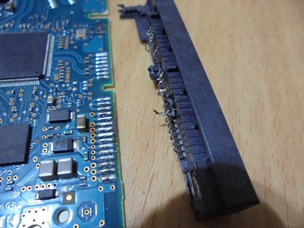 【宅配維修】TOSHIBA東芝1TB→3.5吋硬碟為品牌電腦出廠時搭載~不明原因短路後燒毀SATA電源接座15Pin→電源接口焦黑完全無法使用~要救出硬碟裏的檔案資料→由硬碟電路板拆下燒毀的15Pin接座~臺東縣臺東市-陳先生【方式不同針腳全數歪斜】