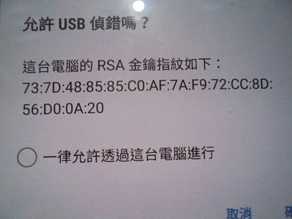 SAMSUNG三星Note 5~SM-N9208智慧型手機32GB的Micro USB接座損壞→送三星原廠更換新品後卻被恢復原廠設定~所有檔案資料全數消失不見→想救出簡訊與通話錄音檔~彈出允許USB偵錯嗎?→嘉義縣東石鄉-鄭小姐【這台電腦的RSA金鑰如下:16組】 SAMSUNG三星Note 5→GALAXY智慧型手機32GB的Micro USB接座損壞~送SAMSUNG原廠更換新品卻被恢復原廠設定→手機裏檔案資料全數消失不見~想救出簡訊與通話錄音檔→USB偵錯>當USB連接時將啟動USB除錯模式~嘉義縣東石鄉-鄭小姐【右撥至ON】