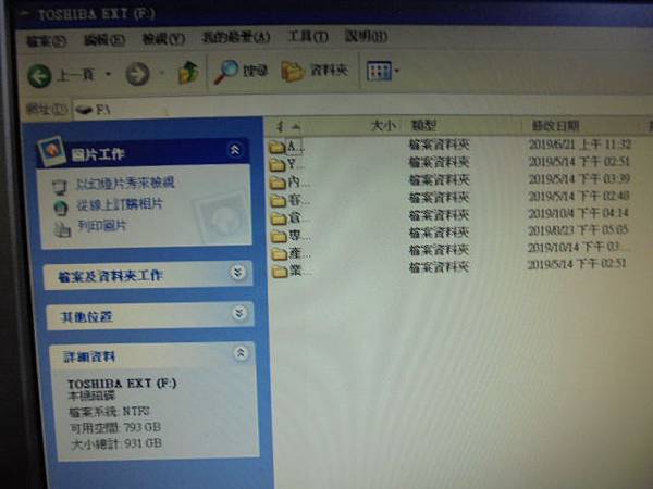 【現場解決】TOSHIBA東芝V5外接式硬碟1TB→傳輸線的Mini USB接座使用時掉落~導致無法使用及讀取→硬碟裏均是公司使用的重要檔案~要解決接座問題讀取檔案資料→點進TOSHIBA EXT(F:)~新北市板橋區-李小姐【8個資料夾依據檔案類型做排列】