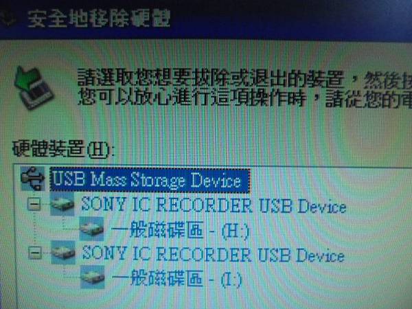 【救回錄音】SONY索尼ICD-UX523F~4GB錄音筆當天下午剛錄好的音檔→在錄音筆中找不到錄音檔案~問過很多朋友都說一定救不回→已救回二個多小時的訪談錄音檔案~硬體裝置(H):Mass Storage Device→新北市新店區-韓小姐【安全地移除硬體】