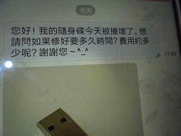 【送來檢修】ADATA威剛MY FLASH(精靈碟)PD1→1GB隨身碟插在電腦使用~不小心撞歪USB接頭導致無法讀取→上網搜尋找到我的維修經驗~要救回隨身碟裏所有工作檔案→下午17:02分以LINE傳送文字~新北市板橋區-楊小姐【詢問維修時間與維修費用】