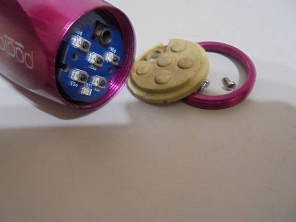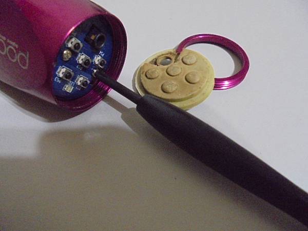 【來電詢問】podio百剛BA-205隨身音樂棒2GB→騎腳踏車時裝上這隻數位隨身音響聆聽音樂~播放MP3音樂時覺得喇叭破音聽起來不舒服→要修好這隻音樂棒繼續使用~將桃紅色音樂棒側放於桌面→新北市土城區-李先生【取工具鬆開音樂棒頂部金屬環】