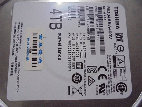 【搭火車來】TOSHIBA東芝3.5吋~4TB裸碟當資料碟使用→自己不慎折斷SATA訊號接座7Pin塑膠片後無法使用~surveillance監控→要修好硬碟SATA接座取出重要檔案~TOSHIBA東芝原廠標籤與富基電通保固標籤→桃園市中壢區-黃先生【DATE:20161002】