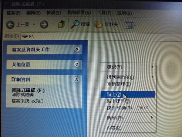 【騎車送回】SAMSUNG三星128GB記憶卡Micro SDXC~裝在SONY索尼運動攝影機→上午拍攝好告別式影片~記憶卡插讀卡機連接電腦卻搞砸檔案消失不見→已救回MP4檔案~滑鼠點進卸除式磁碟(F:)→臺北市安和路-蕭小姐【滑鼠右鍵工具列滑至貼上(P)】 【當晚救出】SAMSUNG三星Micro SDXC記憶卡128GB→裝在SONY索尼運動攝影機~上午拍攝好告別式影片→記憶卡插讀卡機連接電腦卻搞砸檔案消失不見~已救回MP4影片→SAMSUNG Micro SDXC 128GB~臺北市安和路-蕭小姐【滑鼠右鍵工具列滑至複製C】