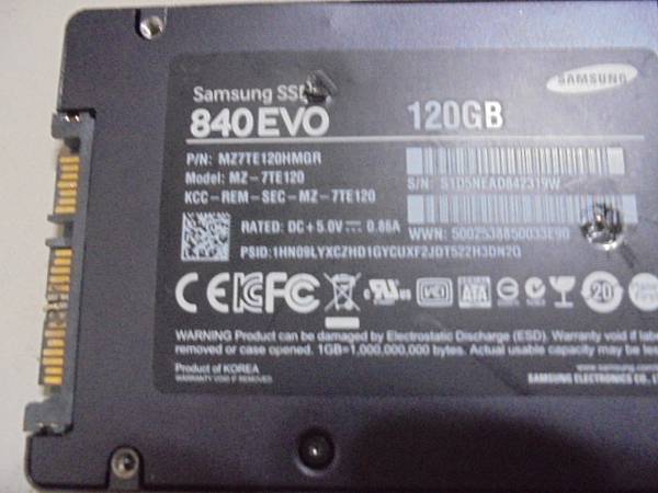 【處理接口】SAMSUNG三星840 EVO→120GB為開機SSD硬碟~清理PC電源供應器時SATA電源接口突然燒焦變黑→SATA電源15Pin接座焦黑~要修好SSD救出桌面報價檔案→客戶以夾鏈袋裝好SSD硬碟送修~臺北市涼州街-王先生【SSD背面有原價屋購買標籤】