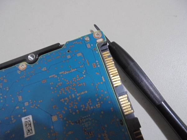 【完修取回】TOSHIBA東芝S300~3.5吋10TB影音監控硬碟為資料碟→插拔時不慎折斷SATA電源接口15Pin塑膠片~已先將檔案全數做取出→要更換SATA接座再使用裸碟~緩緩小心的拆離黏很緊的裸碟電路板→新北市板橋區-周先生【將裸碟PCB翻至正面】