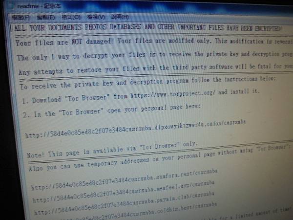 【判定問題】WD威騰160GB~同事的組裝桌上型電腦3.5吋SATA資料碟→中了勒索病毒副檔名被加註.cusrsnba~部份文件檔案被加密無法開啟→要救回重要的Word檔案~點選開啟readme記事本→新北市板橋區-陳先生【勒索病毒相關資訊均列於文字檔內】
