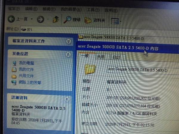 【D碟檔案】Seagate希捷500GB~2.5吋裸碟為acer宏碁NB出廠搭載→某次開機無法進入系統~自行拆出裸碟當外接碟也讀不到C與D分割磁區→已救出D碟的重要檔案資料~DATA(H:)可用空間14GB大小總計223GB→新北市土城區-連先生【點進資料夾】
