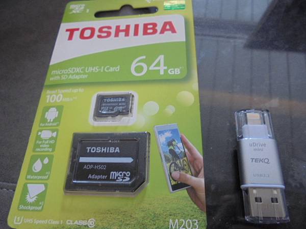 【推薦使用】TOSHIBA東芝M203→Micro SDXC記憶卡64GB~iPhone手機裏儲存太多照片影片檔案→導致手機使用會卡卡的~購買iOS讀卡機搭配記憶卡備份檔案使用→目視TOSHIBA東芝記憶卡吊卡包裝上~桃園市龜山區-楊小姐【印有防水功能與防震功能】