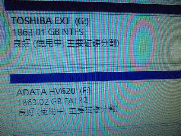 【隔天取回】ADATA威剛2TB~HV620外接式硬碟是友人贈送已很久沒使用→突然發現有很多螞蟻從傳輸線孔跑進跑出~檢測後確認硬碟好的→購買新硬碟複製檔案資料~點進存放裝置磁碟管理→新北市板橋區-林小姐【磁碟區(F:)FAT32磁碟區(G:)NTFS】