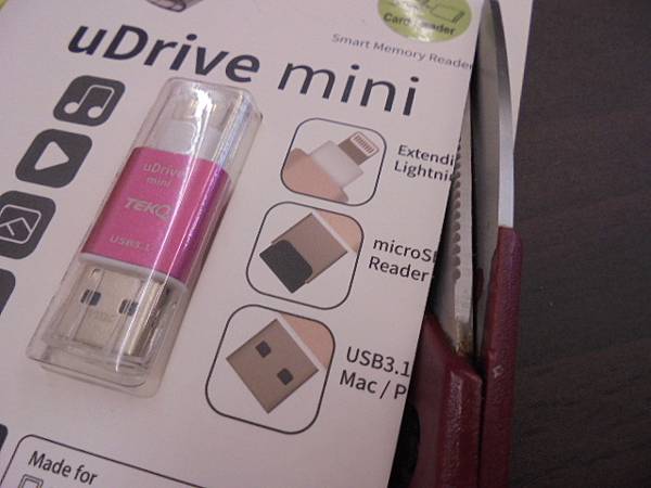 【快速備份】Tekq璿驥uDrive mini讀卡機~Apple蘋果Lightning專用→iPhone X手機裏儲存太多照片影片檔案~導致手機使用會卡卡的→購買使用iOS讀卡機備份檔案~已將包裝翻回正面→新北市板橋區-吳小姐【取剪刀剪開uDrive mini原廠吊卡包裝】