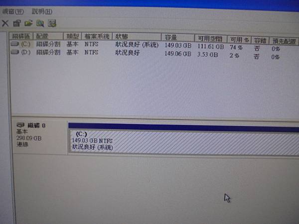 【到府檢測】ASUS華碩CM1735個人電腦→網路伺服器儲存公司重要檔案~已刪除很多檔案硬碟空間仍不足→網路搜尋到我的相關案例~要解決硬碟容量不夠使用問題→磁碟0基本298.09GB連線(C:)149.03GB系統~臺北市忠孝東路-林小姐【(D:)149.06GB】