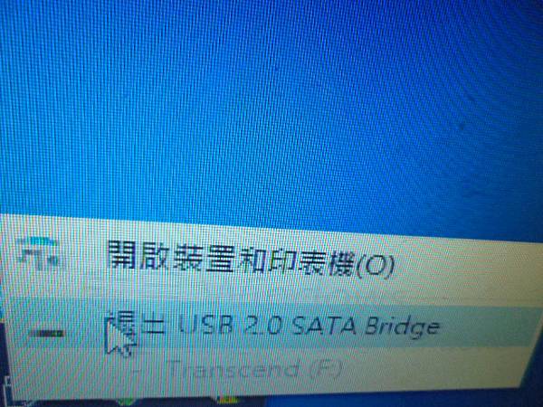 【測試裸碟】Transcend創見StoreJet 25H3→2TB行動硬碟USB 3.0連接公司的電腦使用~常常讀不到這顆硬碟→改接其他電腦亦讀不到裝置~要解決讀不到硬碟問題→滑鼠點退出USB 2.0 SATA Bridge~新北市中和區-阮小姐【可以放心地從電腦中移除】