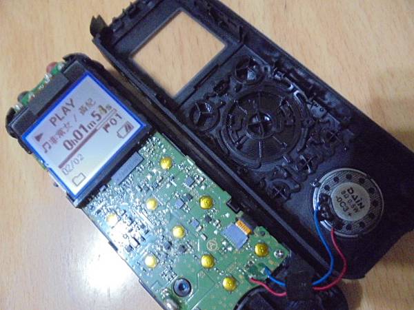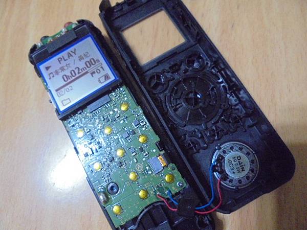 【判定問題】SONY索尼ICD-PX440~4GB錄音筆某天不知原因開不了機→滑動POWER電源鍵都無法開機~下周公務出國要帶出國使用這隻錄音筆→要修好異常問題繼續使用錄音筆~背殼移除後看到錄音筆電路板→新竹市東區-蔡小姐【先將連接排線做拆除】