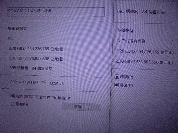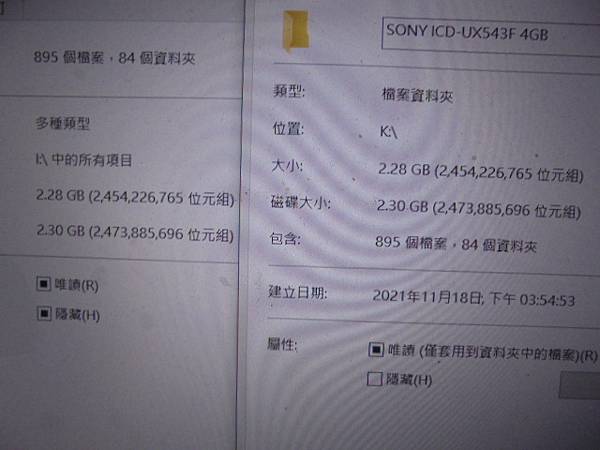 【拆殼檢測】SONY索尼4GB~ICD-UX543F錄音筆連接電腦讀不到裝置→無法傳輸檔案無法充電~錄音筆當隨身碟存重要檔案→已救回錄音筆內建記憶體的重要檔案資料~比對I:與K:兩邊均為895個檔案84個資料夾→新北市永和區-錢先生【磁碟大小2.3GB】