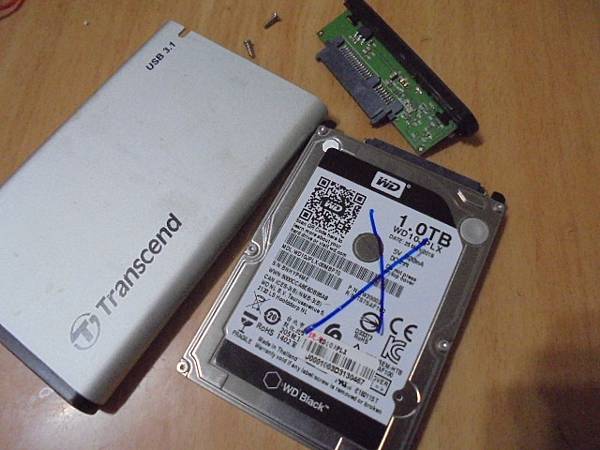 【HGST昱科】WD威騰2.5吋BLACK黑標~1TB裸碟裝在Transcend創見外接盒當外接式資料硬碟→不明原因硬碟讀不到磁區亦無法格式化~要救回硬碟裏家人的工作檔案→備齊宅配寄來時的所有物品~臺中市豐原區-羅先生【外接盒/裸碟/轉機板/兩顆螺絲】