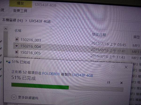 【救出音檔】SONY索尼ICD-UX543F→4GB錄音筆使用多年~某次使用時掉進泡麵中→撿起來操作時功能已經異常~連接電腦讀不到裝置→已救出內建記憶體錄音檔案~33分鐘20%已完成→臺北市成功路-潘先生【將52個項目從FOLDER01複製到UX543F 4GB】