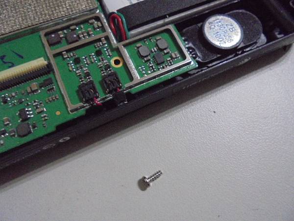 【現場拆殼】GARMIN台灣國際航電nuvi 1480車用衛星導航→GPS導航Mini USB接座接觸不到無法充電~原廠已停止維修在網路找到我→想維修Mini USB接座繼續使用~兩組喇叭排線裝妥於nuvi 1480電路板接座→新北市新莊區-黃先生【PCB對準螺絲孔】