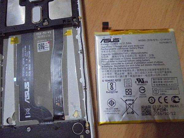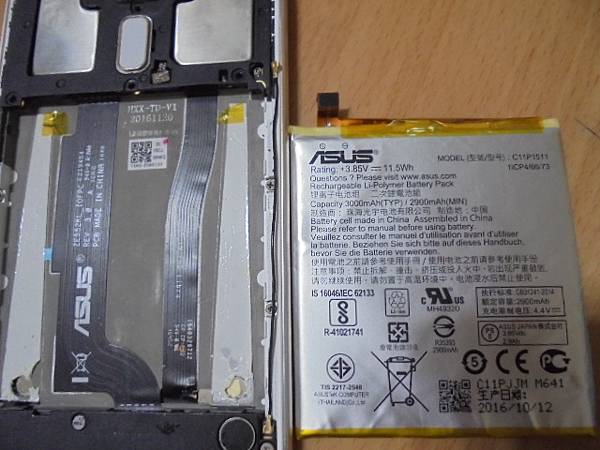 【電池備料】ASUS華碩ZenFone 3~64GB智慧型手機Z012DA→感覺使用多年的手機蓄電力變差~充飽電後很快就沒電→外出需準備行動電源做充電~要更換新的電池→拔開主機板上電池排線~新北市中和區-鄭先生【取出ASUS華碩手機ZE552KL原廠電池】