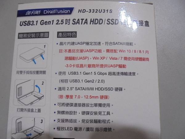 【三種厚度】DigiFusion伽利略~HD-332U31S硬碟外接盒2.5吋USB 3.1→送測ADATA威剛HV620外接式硬碟的USB 3.0接座損壞~必需更換新硬碟外接盒裝進裸碟再使用→使用USB 3.1 Gen1 5Gbps超高速傳輸速度~臺北市師大路-鄭小姐【相容USB 2.0】