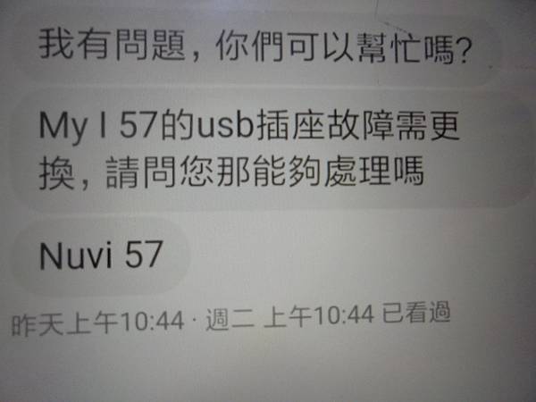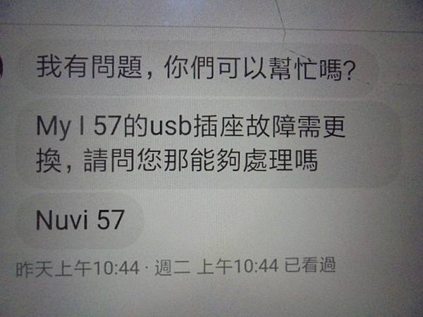【FB粉絲頁】GARMIN台灣國際航電nuvi 57車用衛星導航→GPS導航Mini USB接座接觸不到無法通電使用~儲存近工作使用的百筆導航記錄→要修好接座問題繼續使用~於facebook粉絲專頁文字詢問接座問題→新北市汐止區-高先生【事後做點閱才看到】