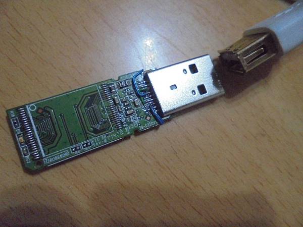 【接捕斷線】Transcend創見700~32GB隨身碟USB 3.0插在電腦讀取資料時→撞歪USB 3.0接頭~扯斷電路板多條印刷線路無法讀取→要救回隨身碟重要工作檔案資料~把Transcend創見700隨身碟電路板接上USB延長線→南投縣魚池鄉-李先生【閃爍藍燈】