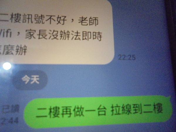 【LINE詢問】HUAWEI華為Wi-Fi無線路由器WS5200→因為二樓教室收不到一樓的無線基地台訊號~但需使用手機連接網路做聯繫→建議增加Wi-Fi無線路由器解決問題~客戶於深夜以LINE文字說明目前遇到的問題→新北市板橋區-李主任【並詢問怎麼解決】 - 2021:
