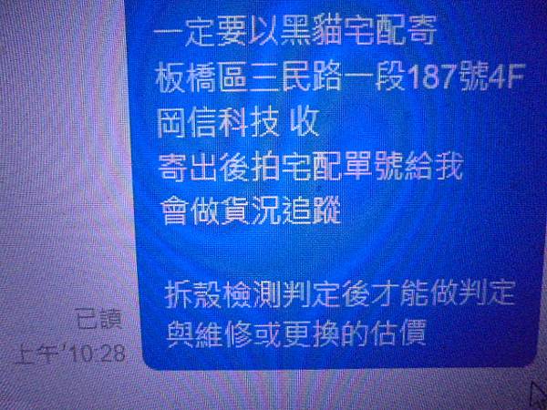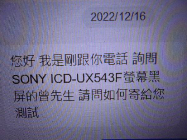【FB粉絲頁】SONY索尼ICD-UX543F→4GB錄音筆是工作錄音使用~先前錄音筆使用都正常→某天OLED螢幕突然轉黑屏看不見字體~無法操控與使用→要修好錄音筆螢幕~上午11:06客戶傳來寄出的宅配單照片→臺北市松德路-曾先生【我收到後文字回覆好】 - 上一篇: