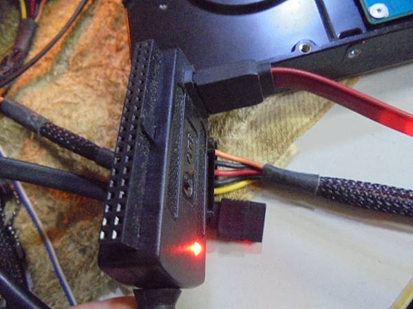 【SATA接座】三個品牌2TB/4TB硬碟九顆→3.5吋裸碟裝在電腦使用~更換插拔時將SATA電源接口15Pin/7Pin塑膠片折斷→導致硬碟無法存取~已更換SATA接座再使用→將轉接裝置的訊號線接上技嘉主機板~新北市樹林區-王先生【轉接裝置閃爍讀取燈號】