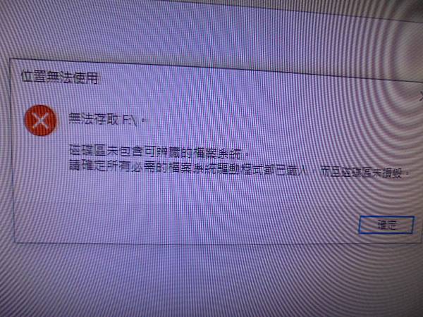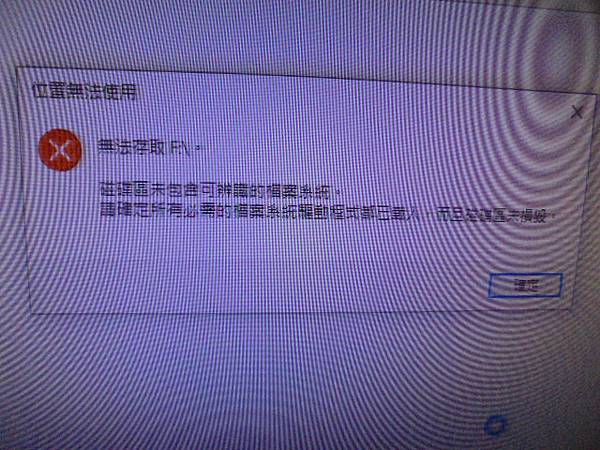 【近七個月】Apacer宇瞻AC233~1TB行動硬碟接在桌上型電腦存取→PC當機後按RESET鍵重新開機~出現無法存取/需格式化視窗→要救回國外旅遊與婚紗照片影片檔案~位置無法使用 無法存取F:→新北市板橋區-周小姐【磁碟區未包含可辨識的檔案系統】