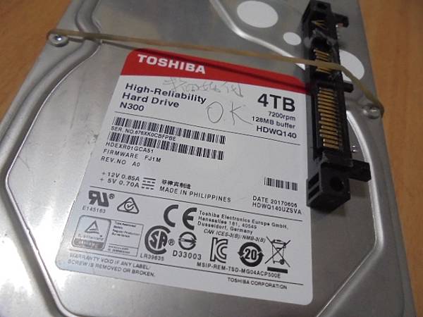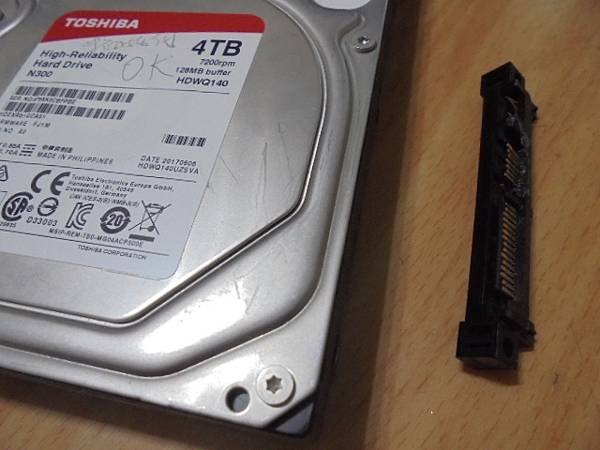 【讀取正確】三家品牌2TB/4TB硬碟九顆~3.5吋裸碟裝在PC使用→更換插拔時將SATA電源接口7Pin/15Pin塑膠片折斷~導致硬碟無法存取→已更換SATA接座讀取檔案~取第四顆標籤貼紙寫明OK字樣→新北市樹林區-王先生【TOSHIBA東芝4TB監控裸碟3.5吋】