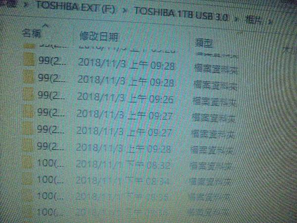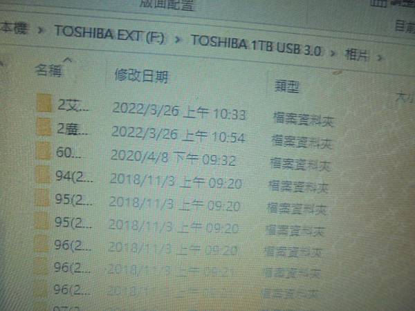 【照片影片】TOSHIBA東芝CANVIO黑靚潮BASICS→A3外接式硬碟1TB USB 3.0接上電腦會出現異音~無法讀取硬碟裏的檔案資料→已救回大學生活與畢業後的旅遊照片~點進相片資料夾列表顯示全部資料夾~新北市中和區-胡小姐【修改日期均與原本相同】