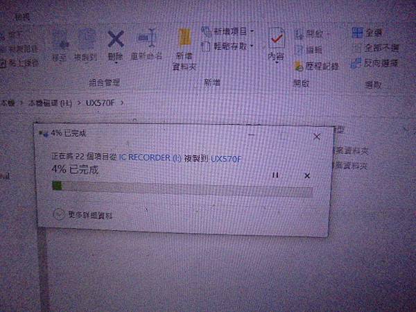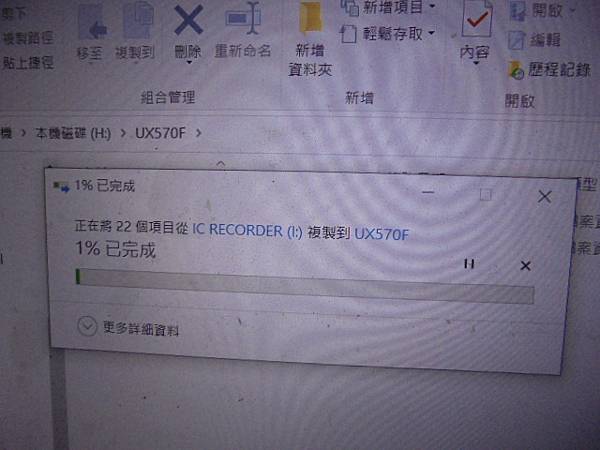 【現場檢測】SONY索尼ICD-UX570F→4GB錄音筆是今年六月購買做工作錄音使用~連接電腦可以正確充電→但是電腦讀不到裝置無法傳輸檔案~已救出重要的錄音檔案→1%已完成正在將22個項目從IC RECORDER(I:)~臺北市松山路-孫小姐【複製到UX570F】