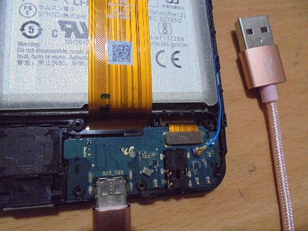 【現場完修】SAMSUNG三星GALAXY M12智慧型手機128GB~SM-M127F昨天入睡前插充電線充電→天亮睡醒後手機沒有電量~換其他充電線也沒用→已修好不能充電問題~SAMSUNG三星M12智慧型手機→臺北市萬大路-鄭小姐【於尾插電路板排線兩側點上黏膠】