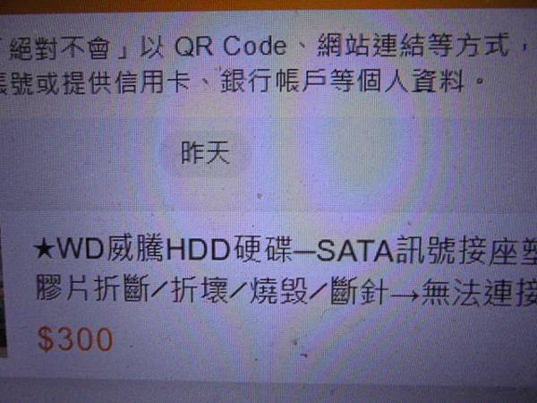 【露天拍賣】WD威騰6TB裸碟3.5吋→裸碟當資料碟插入硬碟座讀取使用~平時放在一米高度的桌面→0403地震時由桌面掉落地毯的地面上~導致7Pin接口塑膠片折壞→詢問WD硬碟SATA訊號接座折斷╱斷針做檢測報價~新北市中和區-林先生【回覆撥打電話】 - 2024: