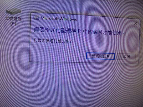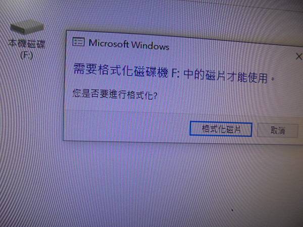 【送達裸碟】TOSHIBA東芝1TB~3.5吋7200轉裸碟是營業場所的PC使用→於正常使用時突然自動關機~按電源鍵重新開機後進不去作業系統→要救回公司重要檔案資料~需要格式化磁碟機F:中的磁片才能使用→新北市土城區-黃先生【您是否要進行格式化】