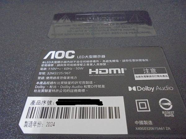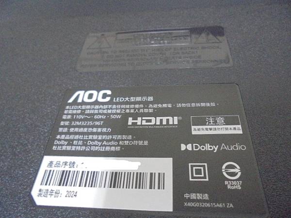 【測試使用】AOC艾德蒙32M3235纖薄邊框液晶顯示器電視~舊的SANLUX三洋電視開機使用時MONITOR會出現雪花→但偶爾顯示器又會回復正常顯示~決定更換新的電視→自AOC艾德蒙原廠紙箱拉出電視機32M3235/96T~新北市板橋區-李小姐【製造年份:2024】