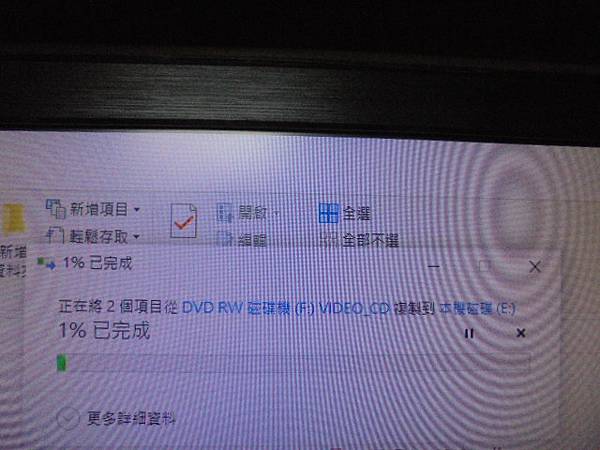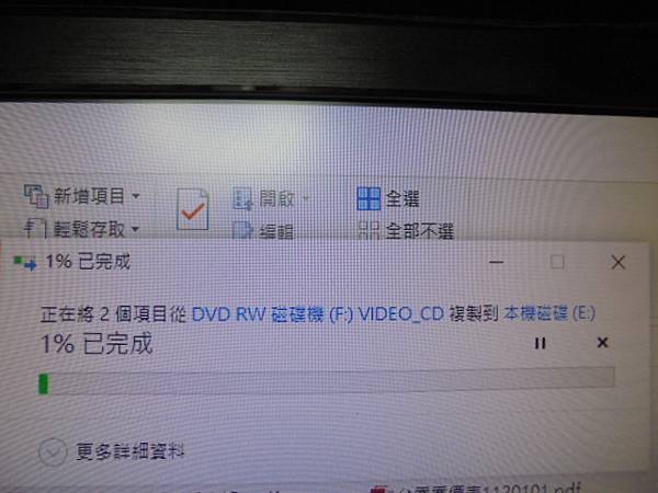 【來電詢問】民國81年4月23日拍攝迎娶與婚宴的錄影帶→已於民國92年11月16日委由其他業者~轉為MPEGAV視訊檔案燒錄為VCD光碟片→要轉為MP4視訊檔案上傳雲端~正在將2個項目從DVD RW磁碟機(F:)→新北市中和區-吳小姐【複製到本機磁碟(E:)1%】