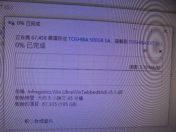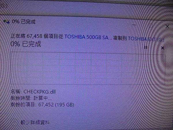 【檔案完整】TOSHIBA東芝500GB~7200轉3.5吋裸碟是公司進銷存電腦使用→正常使用時突然自動關機~重新開機後C槽D槽消失/未初始化磁碟→要救回進銷存檔案資料~正在將67458個檔案複製到TOSHIBA EXT(G:)→新北市鶯歌區-潘先生【0%已完成】